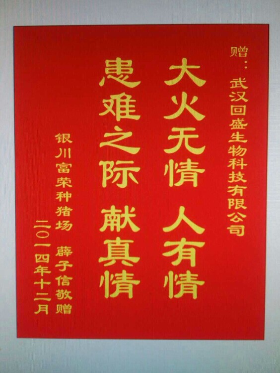 首先,请允许我代表宁夏银川富荣种猪场全体同事对太阳成tyc7111cc公司表达最衷心的感谢!2014年12月9日深夜两点,由于线路老化种猪舍不幸失火,直接损失经产母猪88头,后备母猪200头,300多平米的种猪舍毁于一旦,经济损失达70万余。
