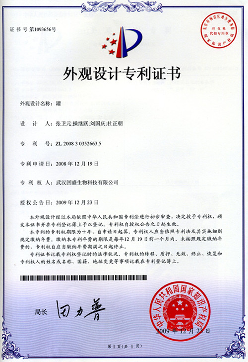 外观设计专利证书(罐专利)