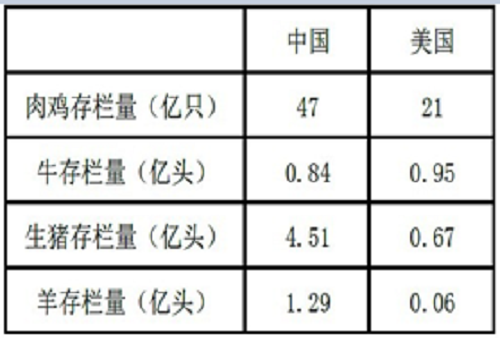 USDA 数据显示,中国肉鸡存栏量是美国的2.2倍,生猪存栏量是6.7倍,羊存栏量20倍。