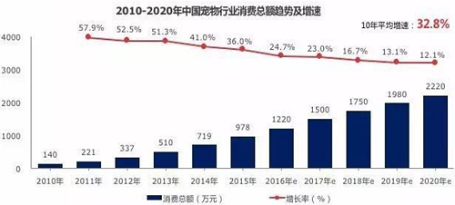 2010-2014年中国宠物行业年均增长到达50.7%,预测到2020年,这十年间将保持年均32.8%的高速发展。2015年中国宠物行业市场规模估计达到978亿人民币,2020年有望突破2000亿人民币。